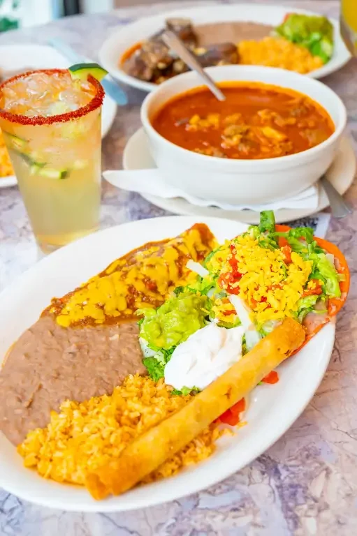 Enchilada, Quesadilla, & Taco served with rice, beans, & child drink. Chicken Nuggets and Grilled Cheese served with French Fries and Child Drink.