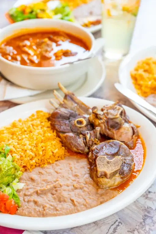 Cabrito "Monterrey Style" served on a bed of Ranchero sauce. Garnished with guacamole salad.